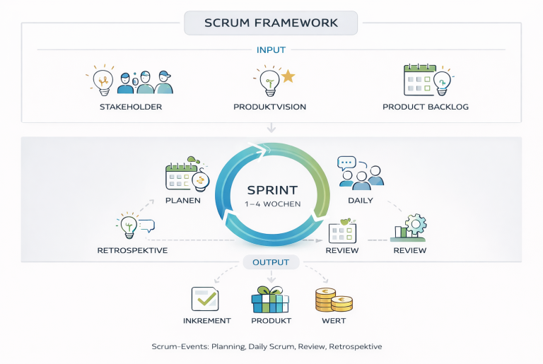 SCRUM bietet einen Rahmen, um genau hier anzusetzen. Durch klare Rollen, feste Abläufe und regelmäßige Reflexion entsteht eine Arbeitsweise, die Orientierung gibt und gleichzeitig genügend Raum für Eigenverantwortung lässt. Teams arbeiten in überschaubaren Schritten, machen Fortschritte sichtbar und können frühzeitig auf Veränderungen reagieren.